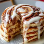 Fluffy pancakes meet gooey cinnamon swirls and cream cheese frosting for a delightful breakfast experience.