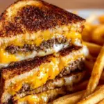 A comforting sandwich that combines the rich flavors of a burger and a grilled cheese, featuring seasoned beef patties, melted cheese, and crispy rye bread.