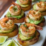 A delightful appetizer featuring garlic-infused shrimp on crispy baguette slices, topped with creamy avocado and a zesty lime sauce.