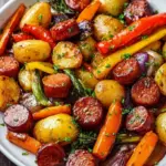 The scent of sizzling kielbasa fills the air, mingling with the sweetness of honey and the earthy aroma of roasted vegetables. It invites you to step into the kitchen and join in the sumptuous spectacle as vibrant bell peppers dance with glossy baby potatoes, creating a melody of color and flavor. The allure of a one-pan meal lies not only in its convenience but in the symphony of textures—from the tender-crisp snap of baby carrots to the smoky richness of the sausage. This is no ordinary dinner; it’s a sweet, garlicky ode to busy weeknights made special.