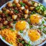 Assemble Your Bowls: It’s time to bring everything together! Divide the crispy potatoes and savory sausage between four bowls. Gently spoon in the scrambled eggs, ensuring each bowl gets its fair share of that comforting goodness. Top with a generous handful of shredded cheddar cheese and a sprinkle of chopped green onions.