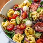 Imagine a summery picnic setup under the shade of a big oak tree: a red-checkered tablecloth sprawled beneath a spread of good food and good company. You scoop up a hearty portion of the tortellini salad onto your plate, letting the fragrance of garlic and fresh herbs envelop you like a warm hug. Each forkful delivers a gratifying blend of flavors and textures, making it impossible to resist going back for seconds. This recipe is more than just food; it’s an invitation to share joyful moments, whether it’s a casual family gathering or a lively barbecue with friends.